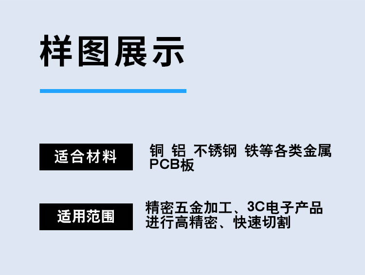 適用范圍廣,可加工銅、鋁、不銹鋼、鐵、pcb板、磁性材料等多鐘材料。幅面大小可選,長度可根據用戶加工需求定制。切割速度快,效果光滑平整,切口沒有機械應力,光滑平整無剪切毛刺。